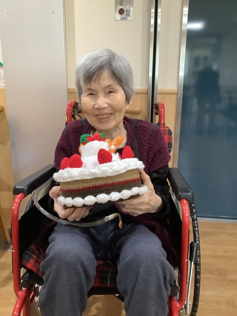 職員の作った毛糸のケーキを持ったりしながら記念撮影♪